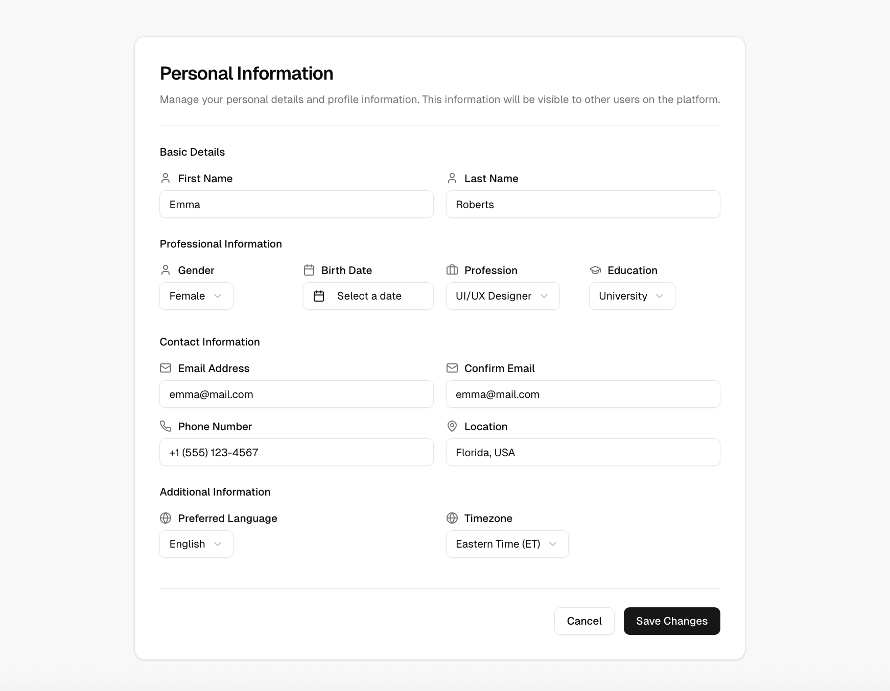 This comprehensive form block enables users to manage personal data including names, contact details, location, and preferences. It’s designed for account dashboards and profile management systems where data input accuracy and user experience are critical. With a clean UI and well-structured fields, it ensures clarity and ease of use.