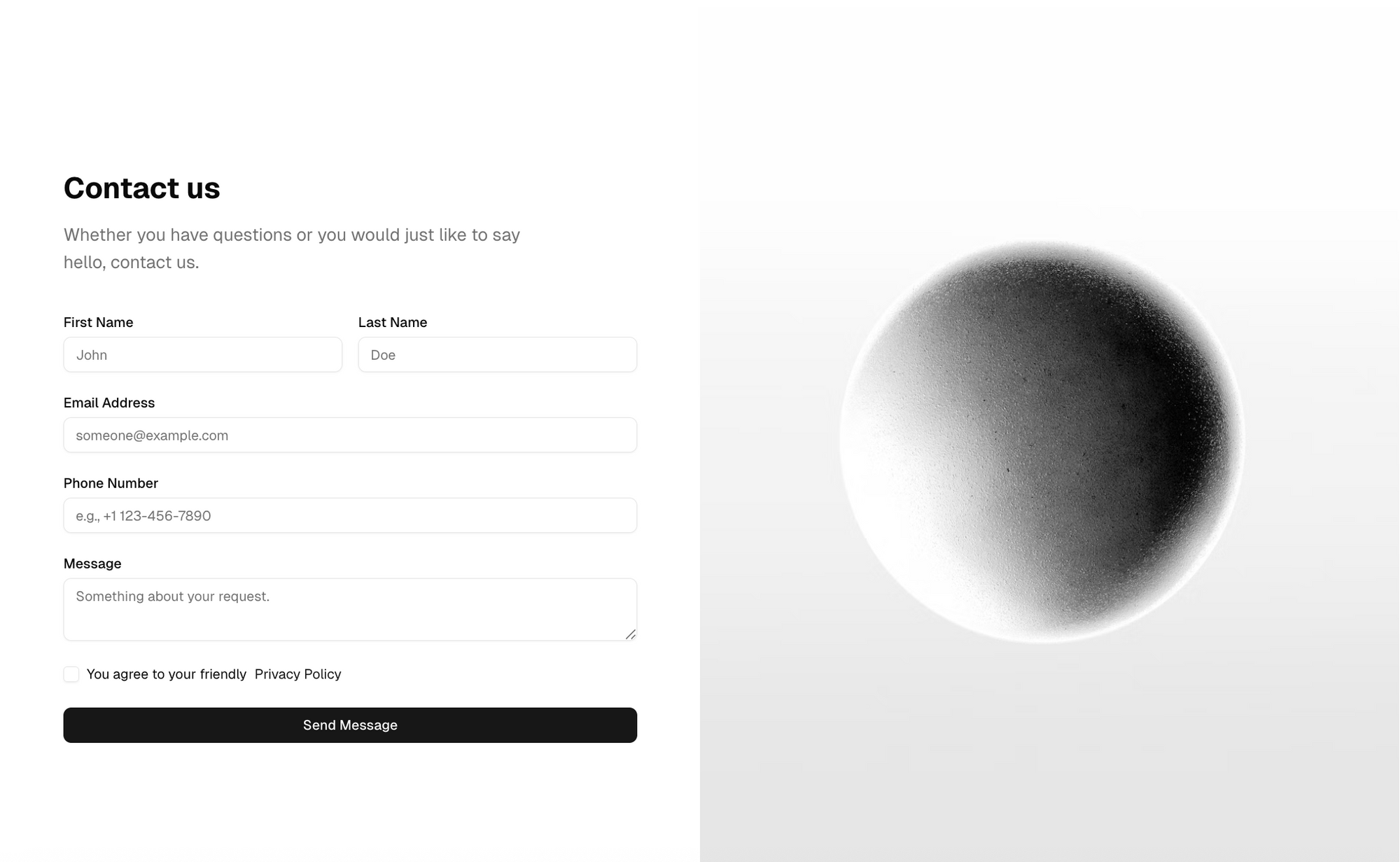This dual-column layout combines a clean contact form with a powerful visual on the side. Great for branding, support, or lead generation pages, it encourages user interaction while maintaining a modern, trustworthy appearance. Includes input fields, message area, and a checkbox for consent or privacy agreement.