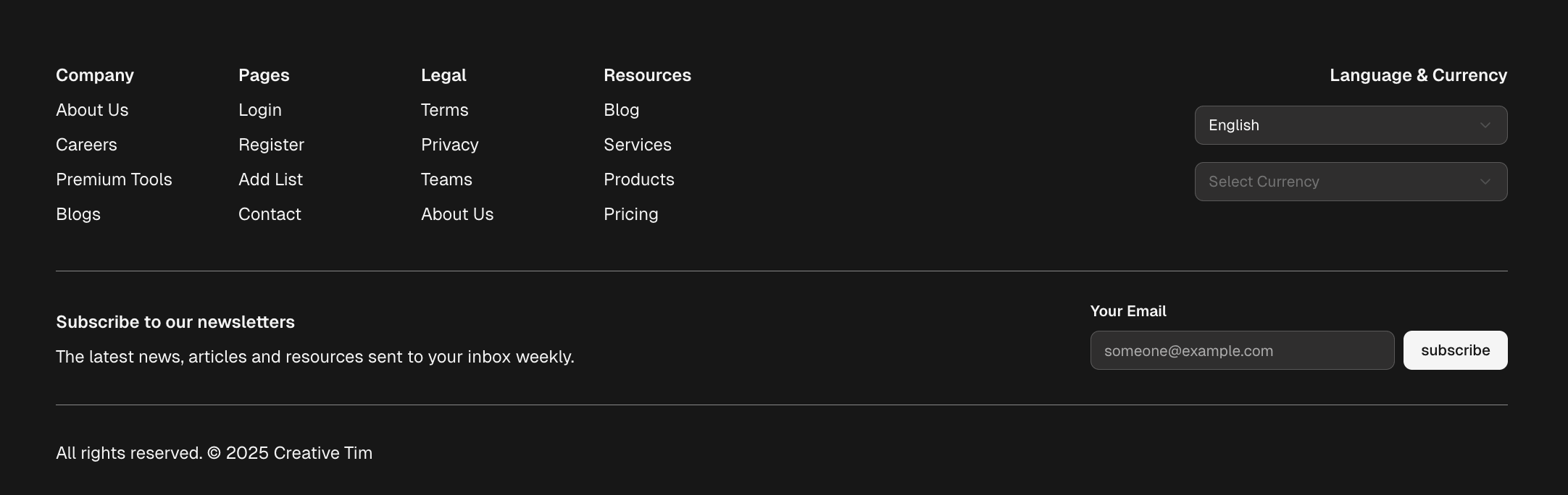 This advanced footer layout is perfect for modern websites needing rich navigation and social links. It includes multiple columns for organizing resources, legal information, and company details, all in a dark theme. Great for web apps and landing pages looking for a professional, structured, and accessible design solution.