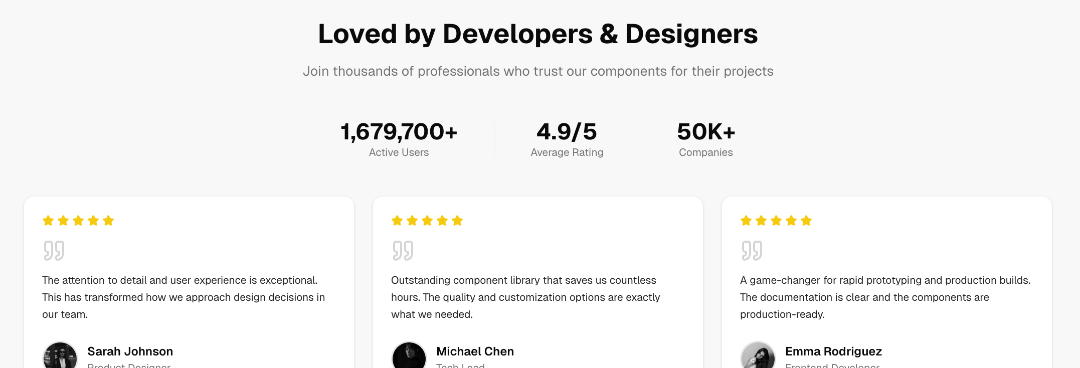 Showcase user feedback alongside impact statistics such as performance, engagement, or ratings. This testimonial layout builds trust with new users by combining qualitative quotes with quantitative success metrics. Perfect for marketing, product pages, and landing sites where proof of value is crucial to conversions.