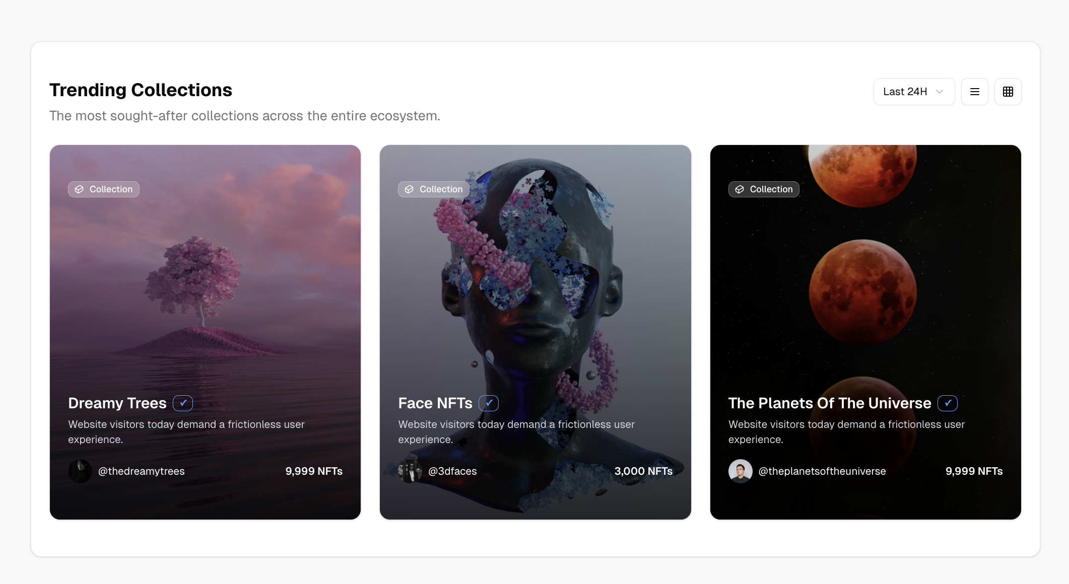 Highlight the hottest NFT collections using vibrant gradients, overlay effects, and trending tags. This block is built for Web3 projects that want to feature digital assets in a visually compelling way. Perfect for marketplaces, dashboards, and crypto portfolio apps looking to increase visibility of high-performing NFTs.